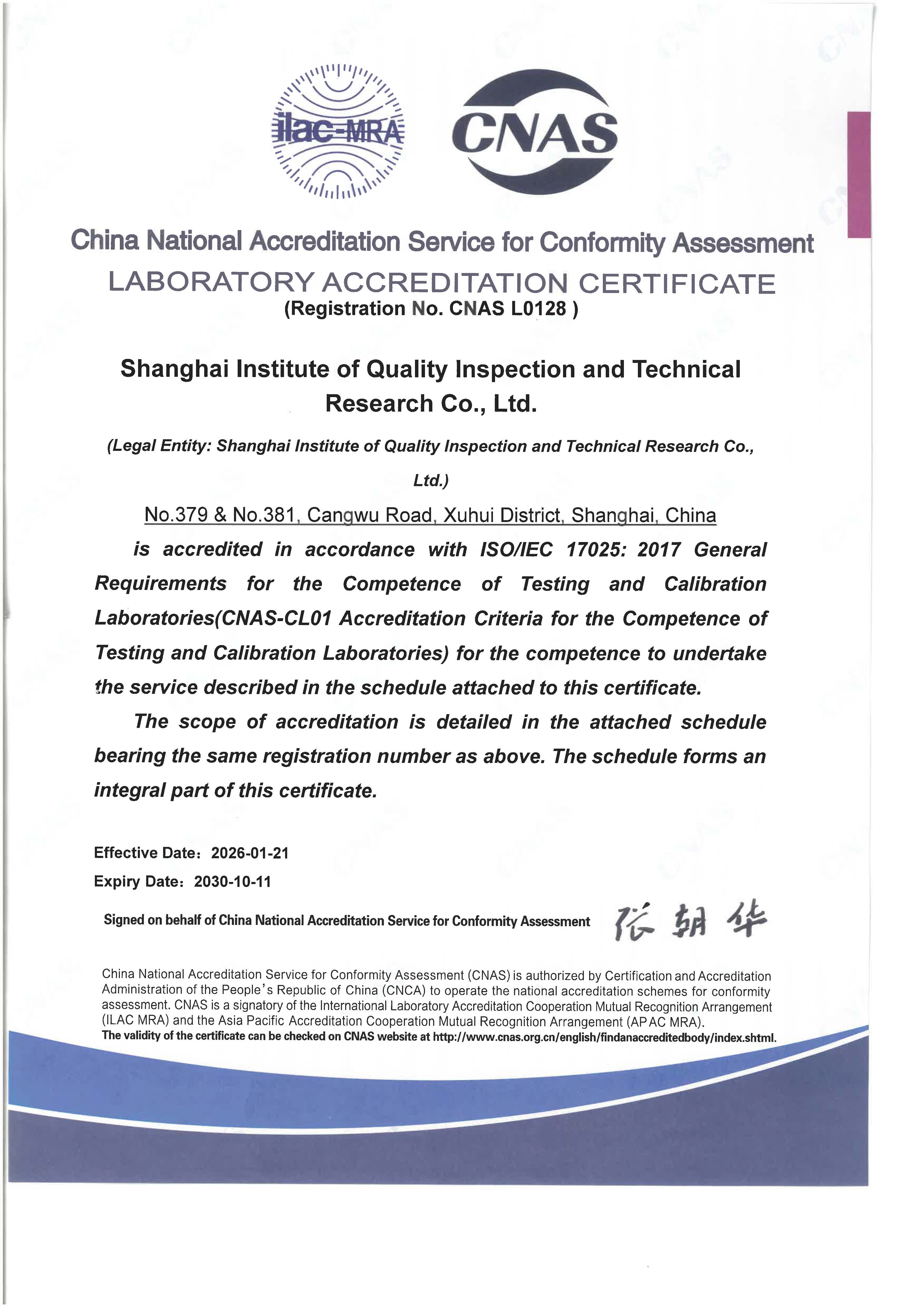 认可的检测能力范围(英文)静安区延安中路
