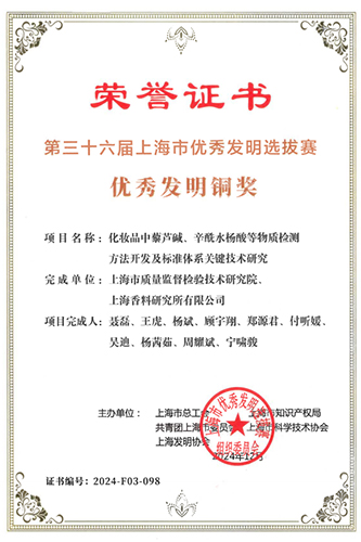 近日,我院周耀斌创新工作室团队申报的《化妆品中藜芦碱、辛酰水杨酸等物质检测方法开发及标准体系关键技术研究》项目获第三十六届上海市优秀发明选拔赛优秀发明铜奖。