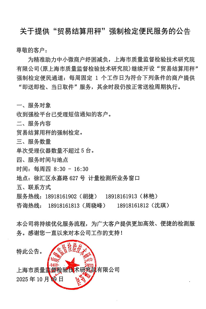 关于提供“贸易结算用秤”强制检定便民服务的公告