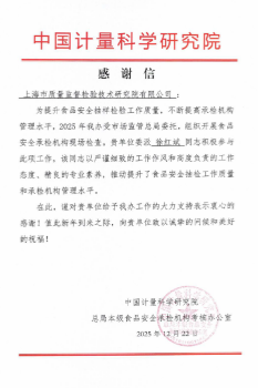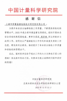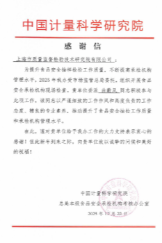 近日,我院收到中国计量科学研究院、国家市场监管总局本级食品安全承检机构考核办公室感谢信。
