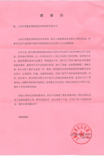 来信感谢了我院一年多来在营养成分检测、产品标签及技术咨询等方面为新雅提供的优质服务。在国家新修订的GB 7718《预包装食品标签通则》发布后,我院主动对接企业需求,协助企业深入解读标准条款,准确把握法规要求,并在标签内容设计、格式规范等关键环节及时纠偏,助力企业高效完成系列产品标签提前更新工作。新雅在信中赞扬我院响应积极、技术能力出众、服务质量优异,并期待未来建立更加紧密、长效的合作关系。