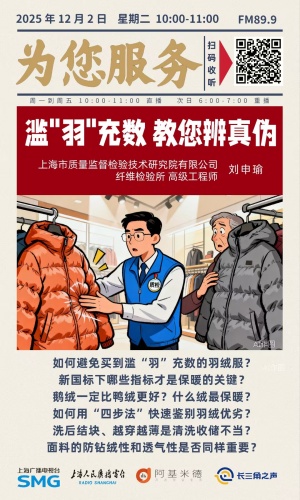 日,我院纤检所专家受邀做客上海广播电台长三角之声的《为您服务》节目,介绍了羽绒服的选购门道以及羽绒产品的清洁维护储存的秘诀。