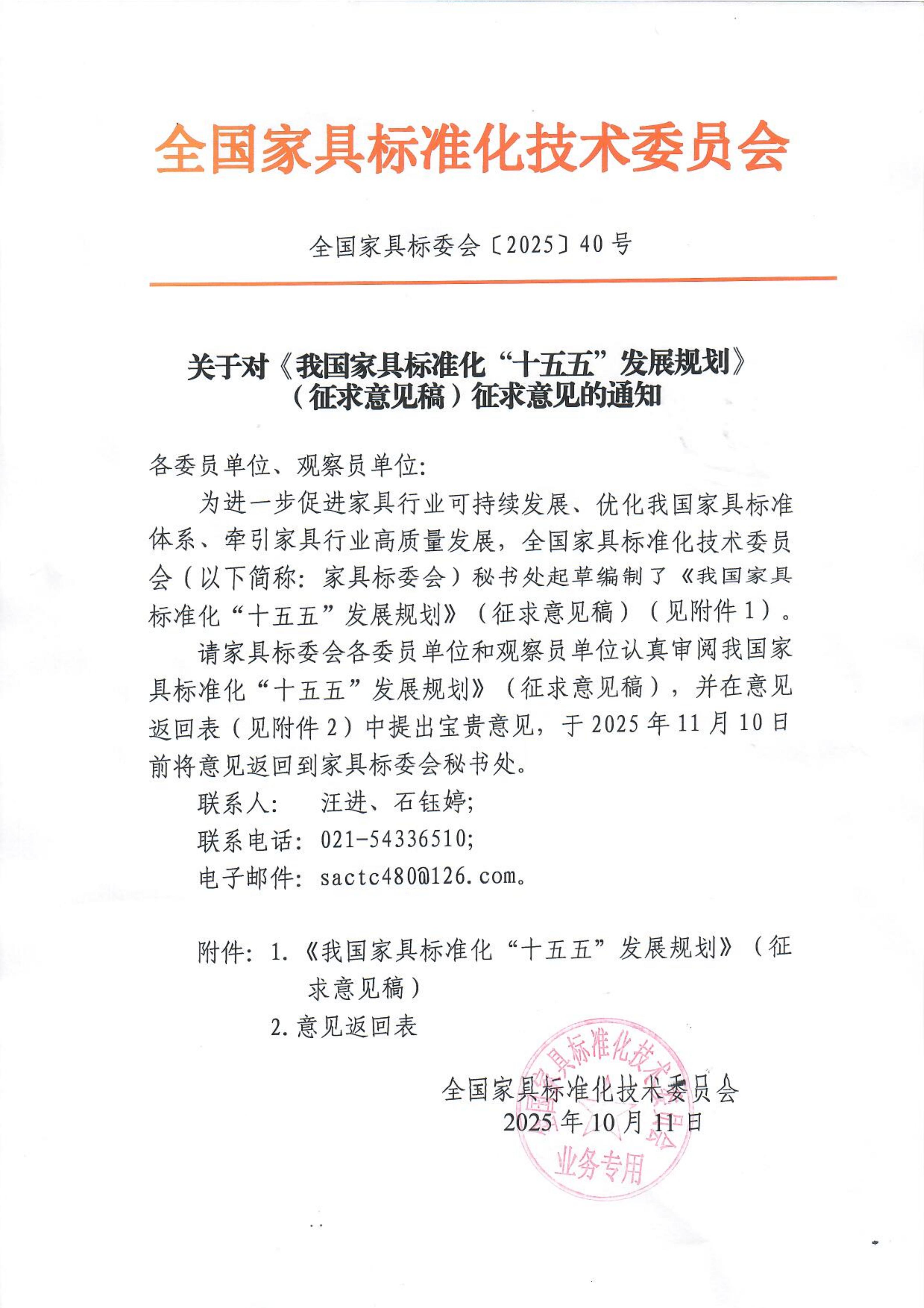 关于对《我国家具标准化“十五五”发展规划》(征求意见稿)征求意见的通知