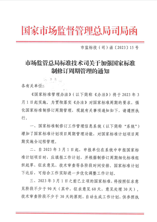 市场监管总局标准技术司关于加强国家标准制修订周期管理的通知