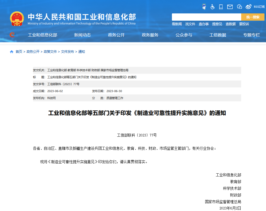 工业和信息化部等五部门印发《制造业可靠性提升实施意见》