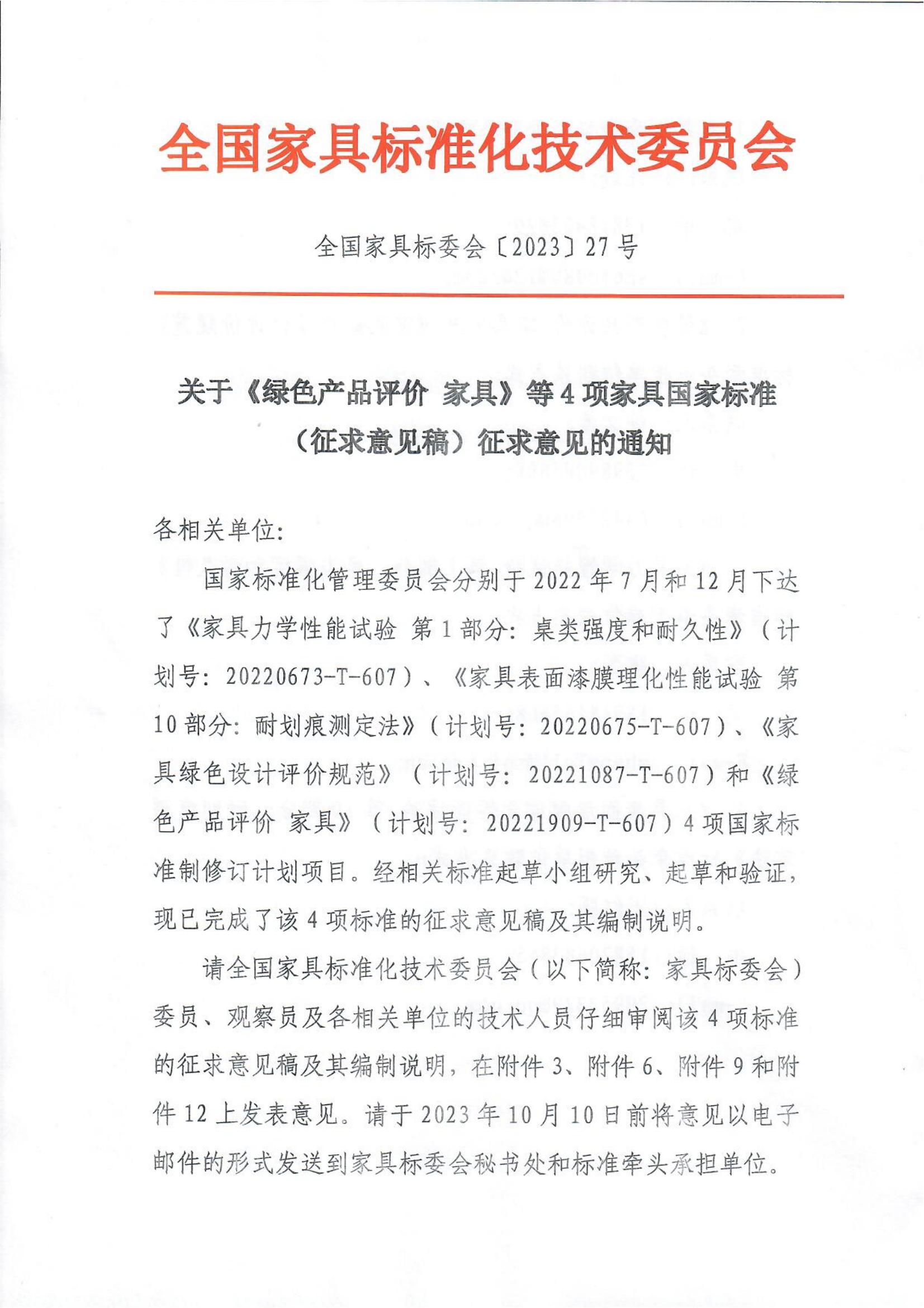 关于《绿色产品评价 家具》等4项家具国家标准(征求意见稿)征求意见的通知