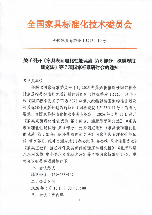 关于召开《家具表面理化性能试验 第5部分:漆膜厚度测定法》等7项国家标准研讨会的通知