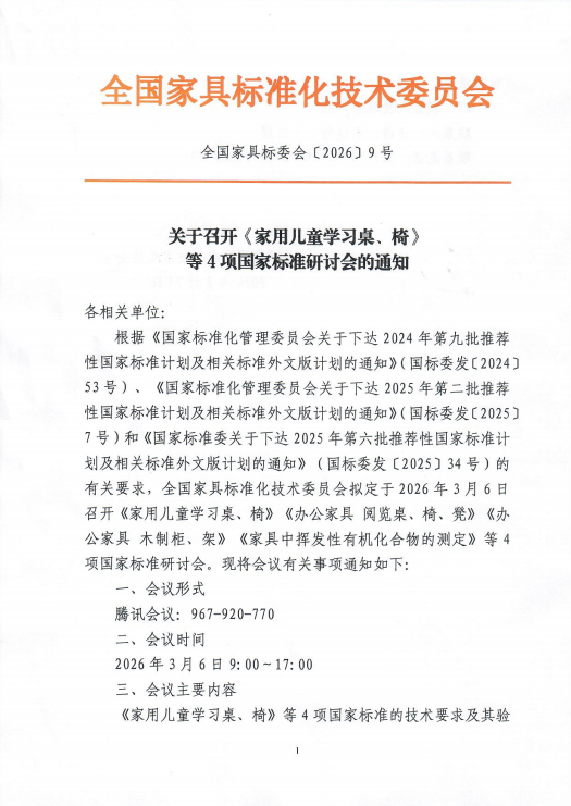 关于召开《家用儿童学习桌、椅》等4项国家标准研讨会的通知