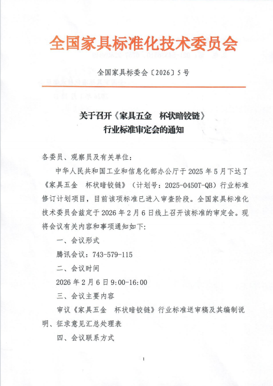 关于召开《家具五金杯状暗铰链》行业标准审定会的通知